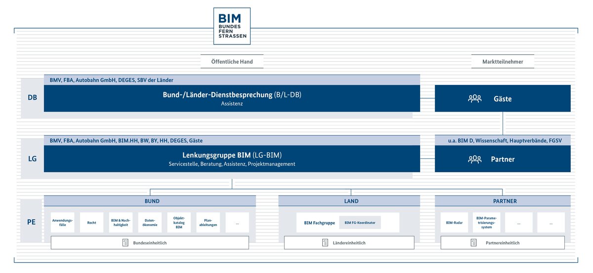 Wenngleich federführend, so ist das BMV nicht allein zuständig in diesem Prozess. Das BMV arbeitet intensiv und eng mit Partnern auf Bundesebene, auf Landesebene, aus der Planung sowie der Bauindustrie, der Wissenschaft, der Forschung sowie aus den Reihen der Verbände zusammen. Höchstes Steuerungs- und Entscheidungsgremium im Implementierungsprozess ist die Bund-/Länder-Dienstbesprechung (B/L-DB) unter Vorsitz des BMV.